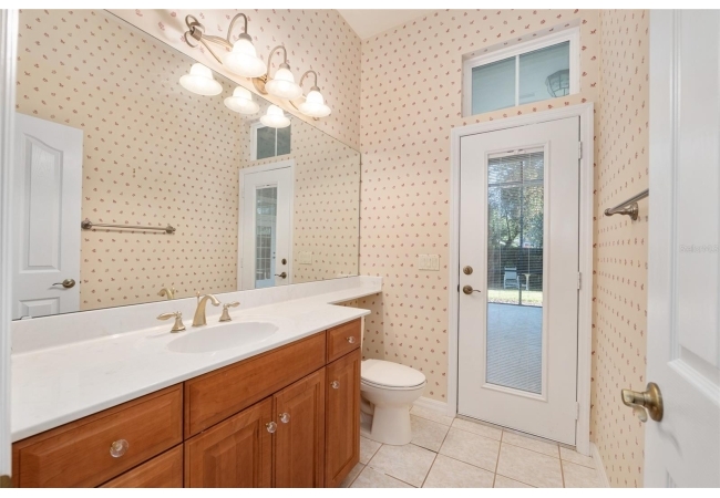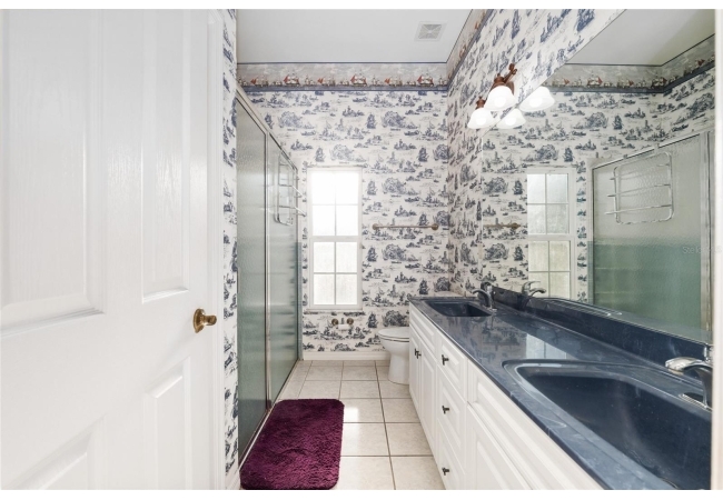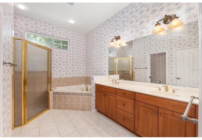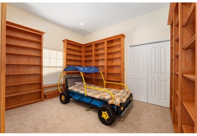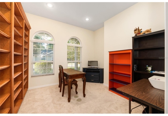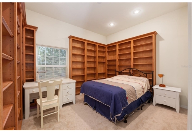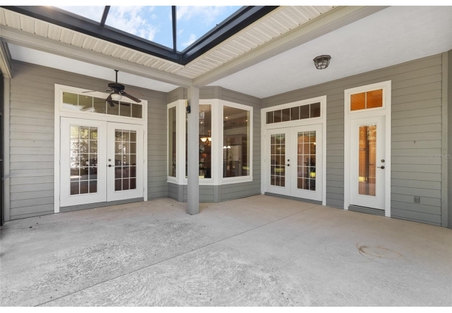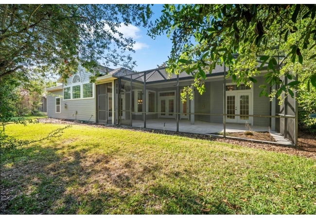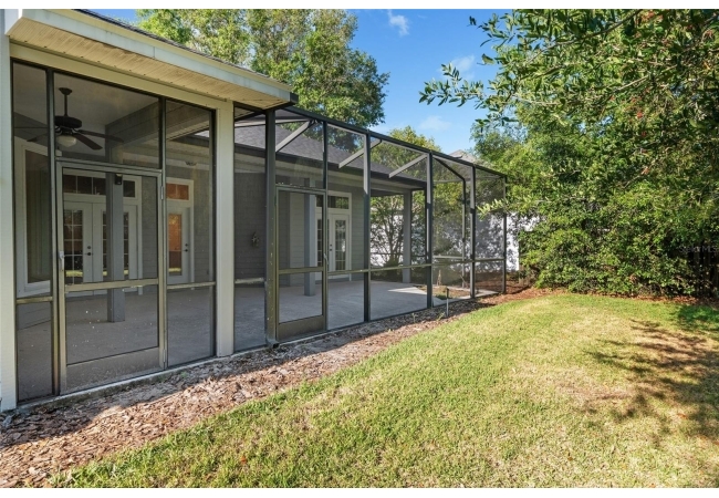 The spacious primary suite offers a private retreat with a tray ceiling, beautiful custom moldings, two walk-in closets, and French doors opening to the lanai. The luxurious en-suite bathroom provides spa-like comfort and style.