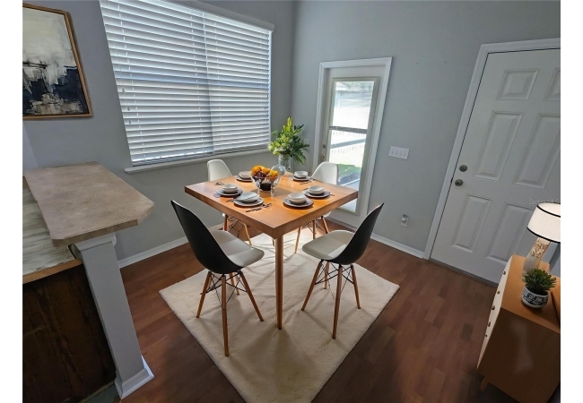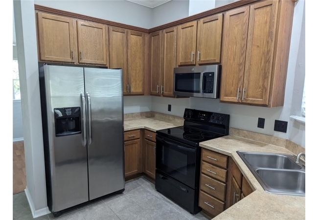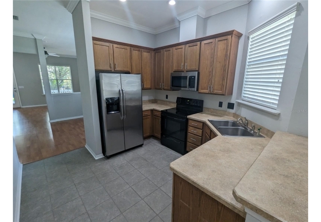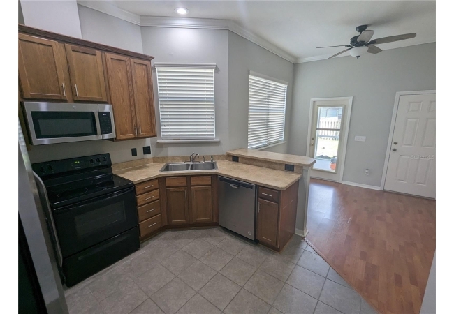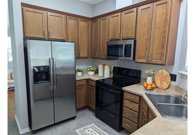 Inside, you’ll love the light-filled open layout, vaulted ceilings, and tile and vinyl flooring that create a sense of spaciousness and flow. The kitchen features tall cabinetry, bar-top seating, and plenty of storage perfect for everyday living.