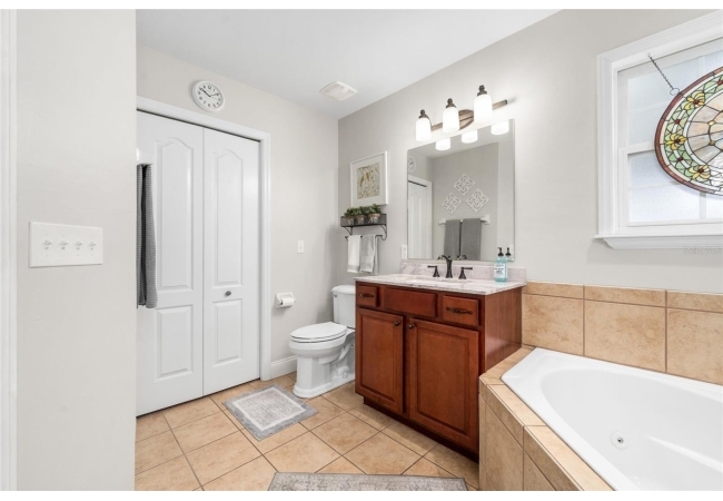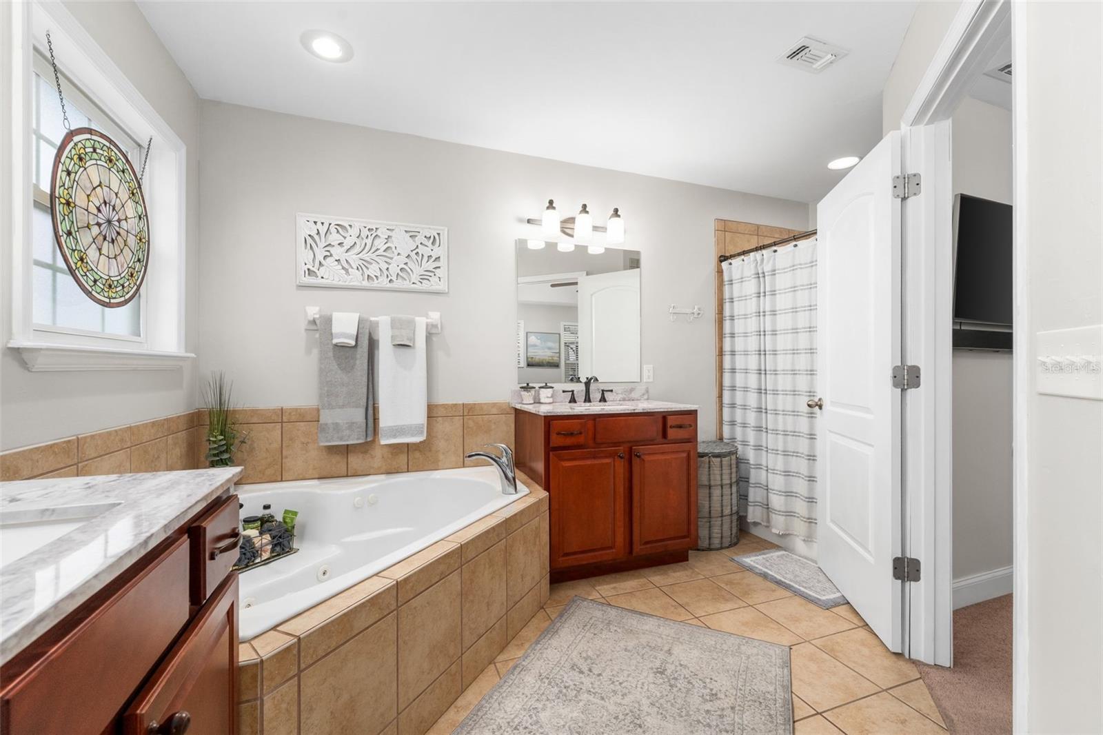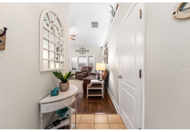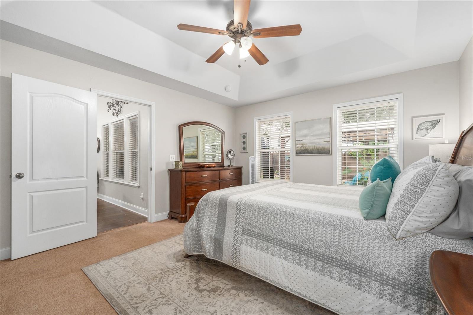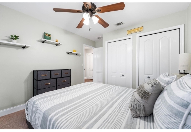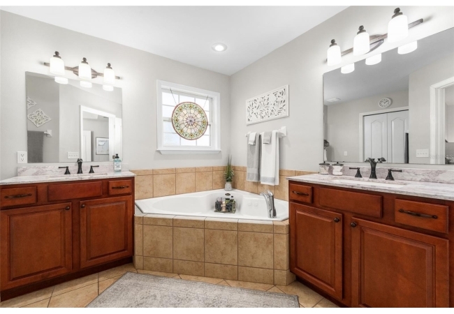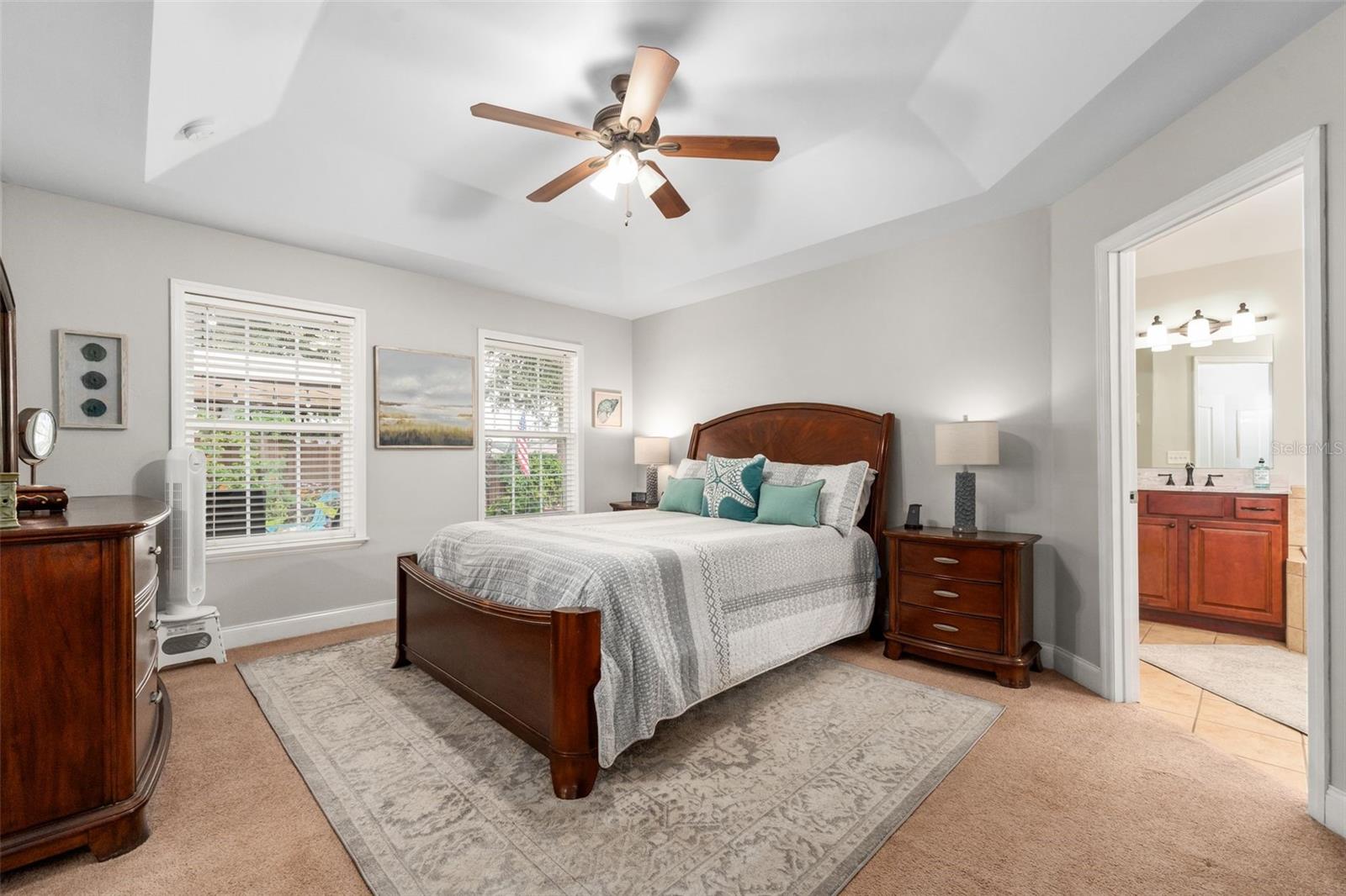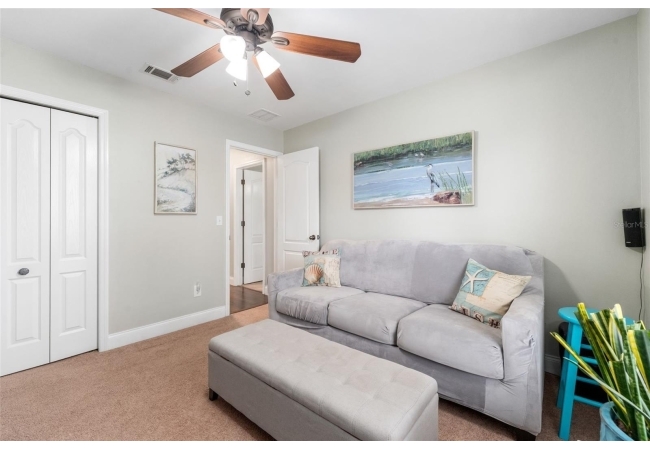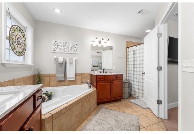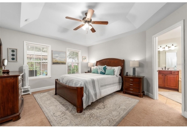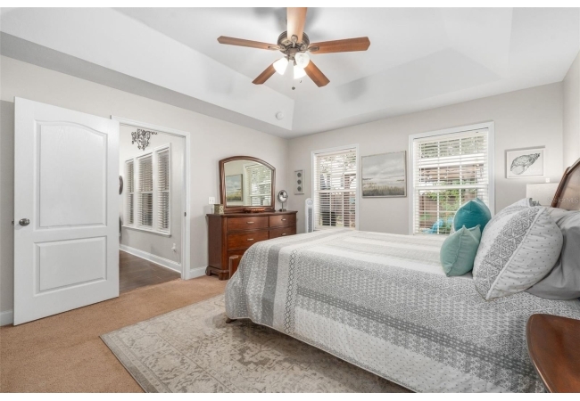 The split floor plan offers privacy, with the primary suite tucked away on one side of the home. Faturing a tray ceiling, a wlarge alk-in closet, and a spa-like ensuite with a jacuzzi tub, seperated vanities. On the opposite side, of the house you’ll find two generously sized guest bedrooms and a shared hall bathroom, connected by a pocket door from the living room for added convenience.