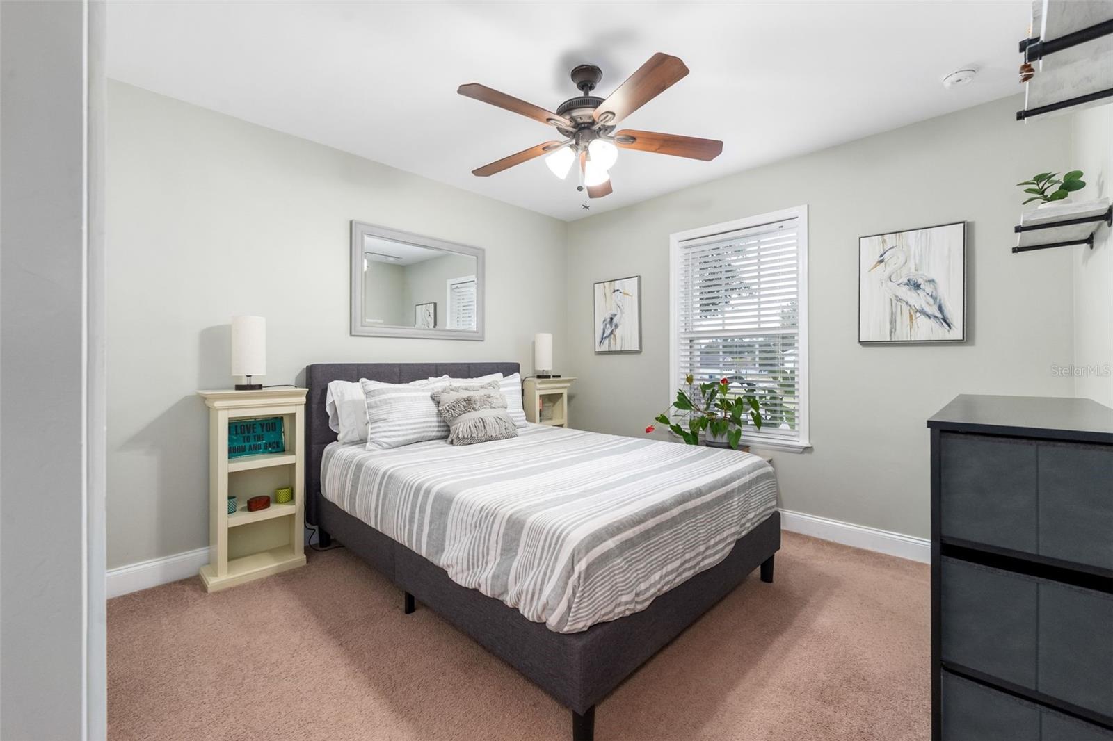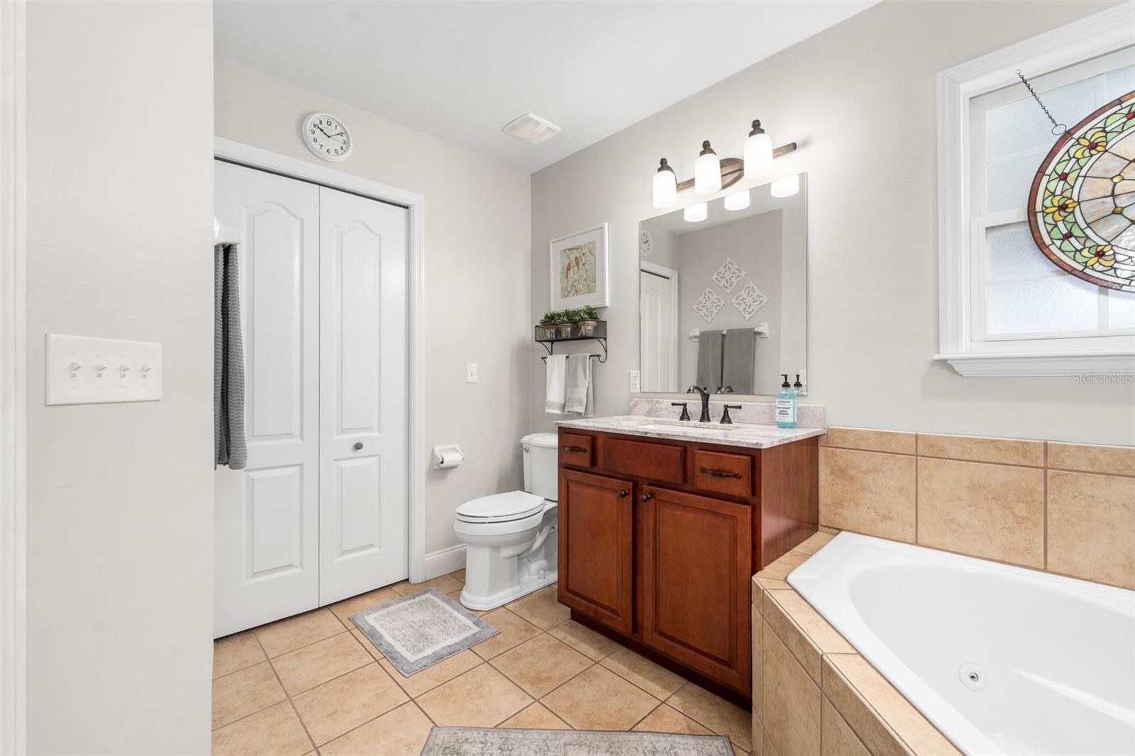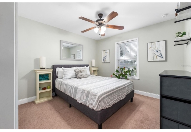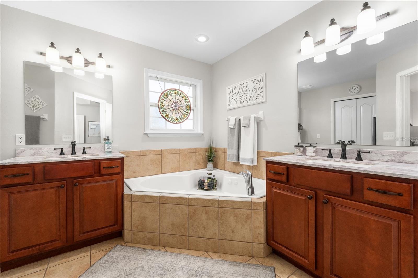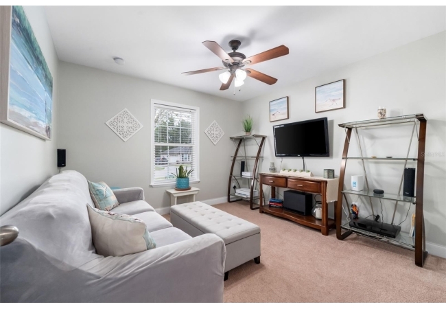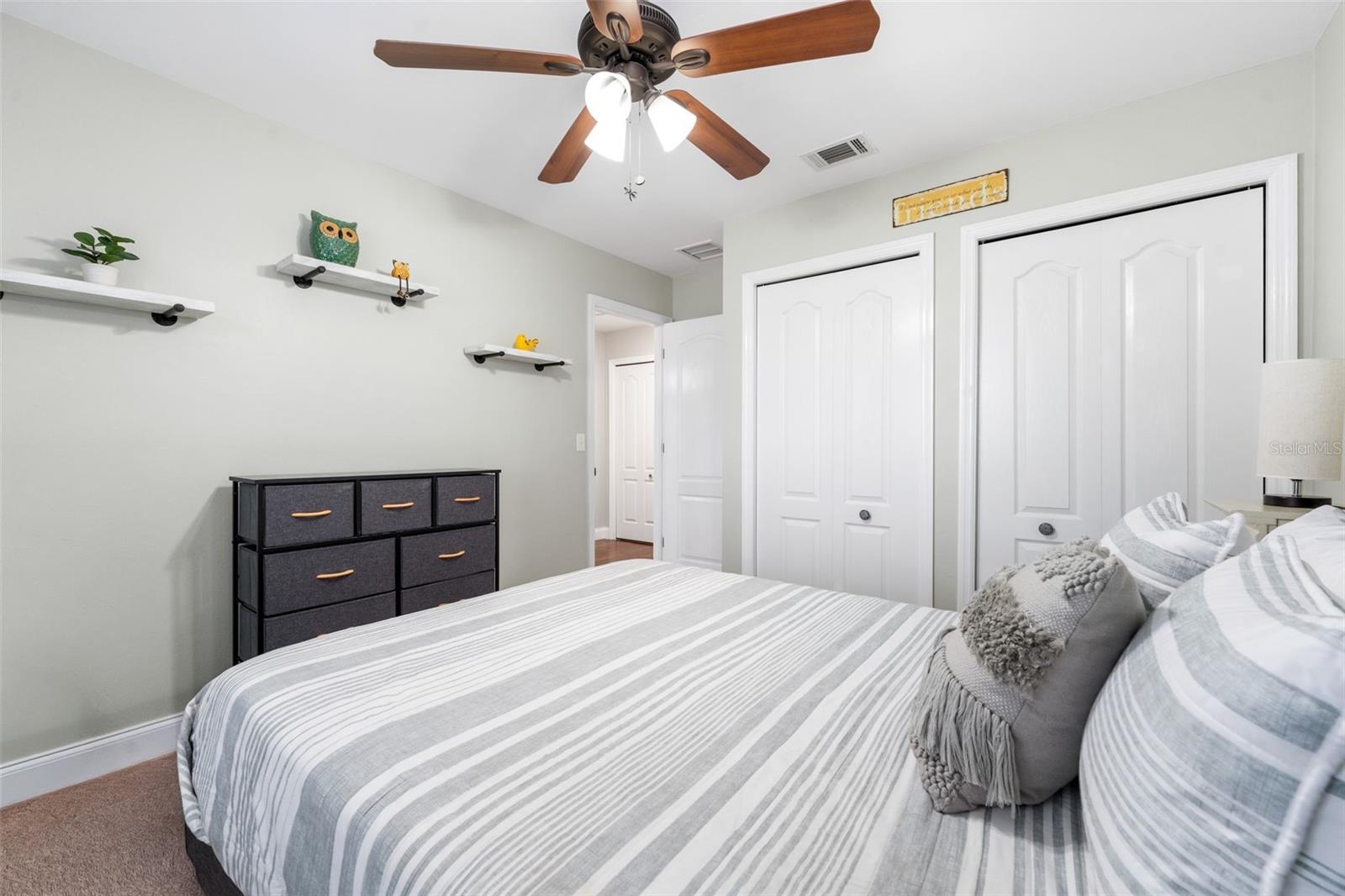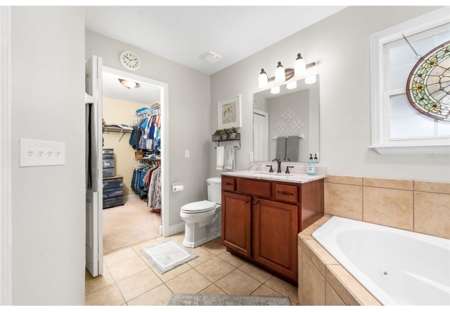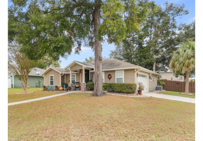 The split floor plan offers privacy, with the primary suite tucked away on one side of the home. Faturing a tray ceiling, a wlarge alk-in closet, and a spa-like ensuite with a jacuzzi tub, seperated vanities. On the opposite side, of the house you’ll find two generously sized guest bedrooms and a shared hall bathroom, connected by a pocket door from the living room for added convenience.