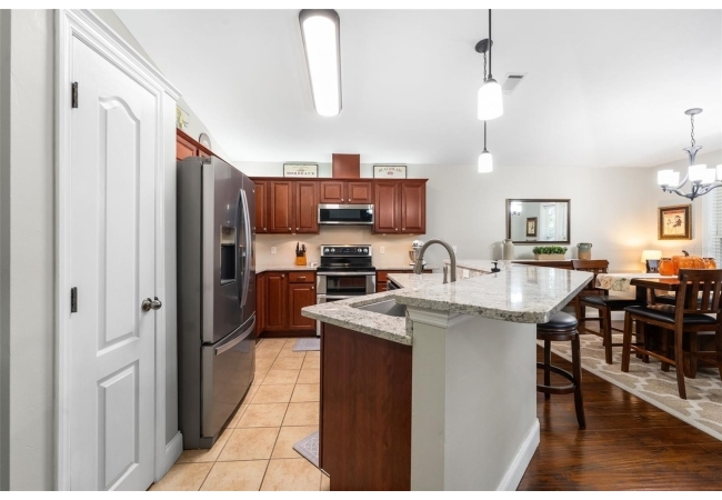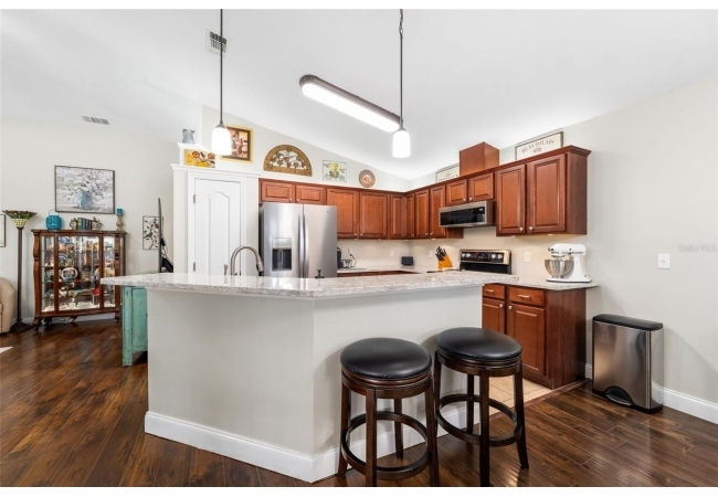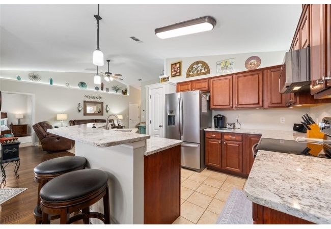 The kitchen is a standout, featuring solid chestnut wood cabinets, granite countertops, stainless steel appliances (2018) including a low-profile microwave and double oven, hanging pendant lights with dimmable settings, a deep basin sink, and a convenient pantry. Tile in the kitchen and laminate flooring flows through the main living spaces, with cozy carpet in the bedrooms.