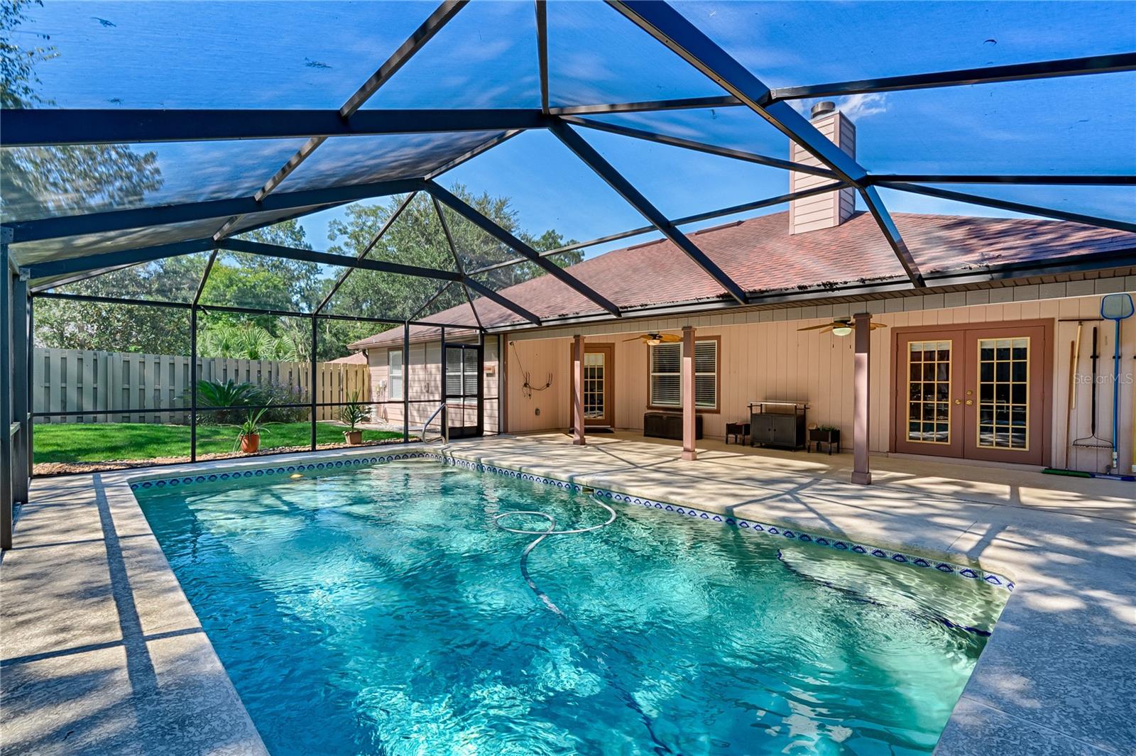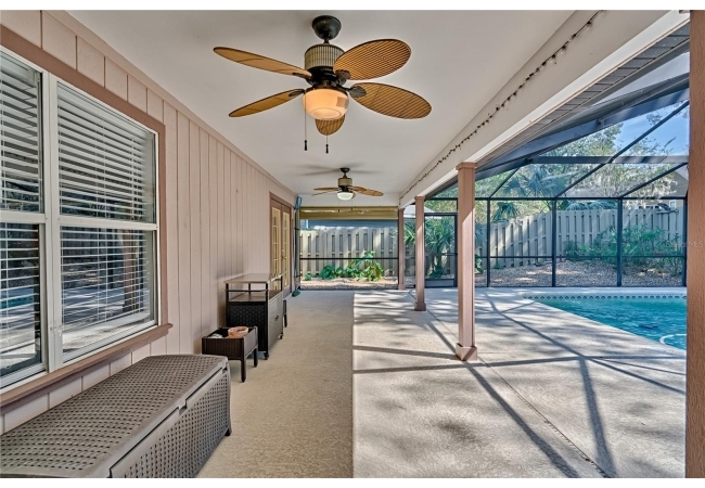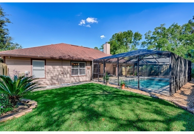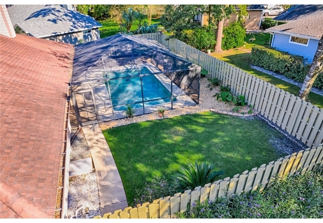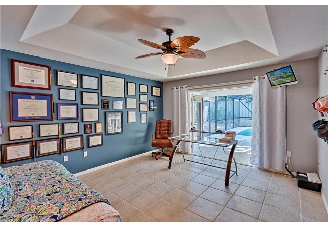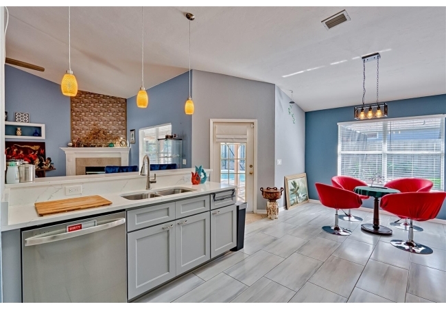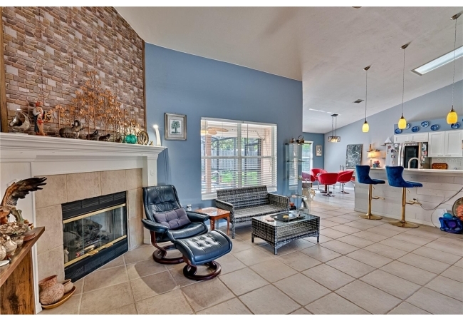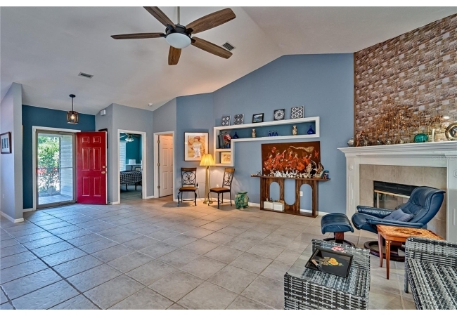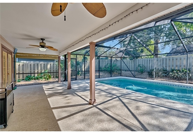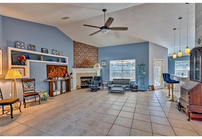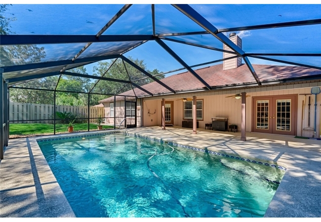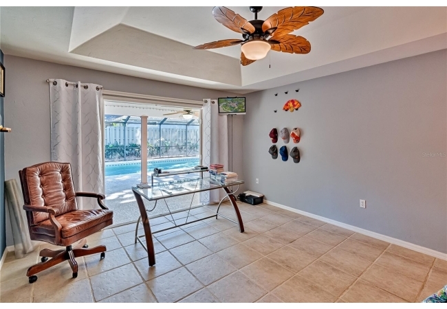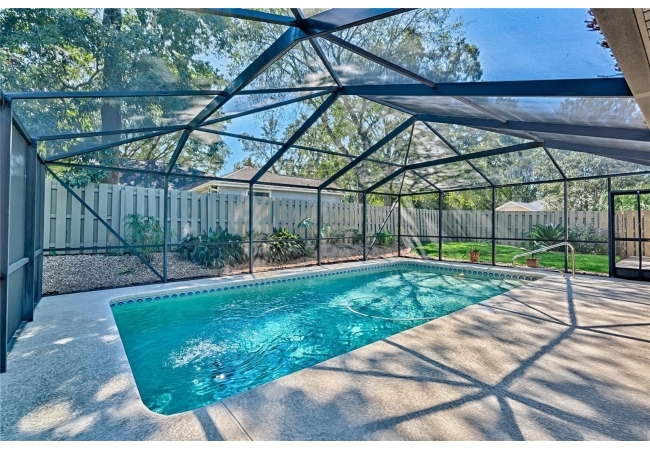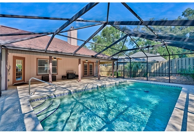 This 3-bedroom, 2-bathroom pool home with an office is located in the sought after Eagle Point Neighborhood! This corner-lot home with 1958 sq feet of space has an open layout. Enter the home to the living room with gas fireplace, views of your back yard and in-ground, screened pool. To the right is an eat in kitchen with breakfast bar and quartz countertops, contemporary cabinetry, tile flooring, pendant lighting and stylish backsplash. The dining area is to your right. The owner's suite has direct pool access, a large walk-in closet with a spa-like bathroom with double vanity, soaking tub and separate walk-in shower. The office continues from the suite and has a direct entrance off the foyer. On the other side of the home are 2 additional bedrooms that share a hall bathroom complete with a step in Kohler Jacuzzi tub. Walk through the laundry area to the two-car garage. The backyard is fully fenced, landscaped. A side garden is ready for planting. The roof is 8 years old. Recent upgrades include new HVAC with a transferable 10-year warranty, new water tank, new clothes dryer, updated lighting fixtures, an enlarged owner's suite bathroom with a barn door dividing bath and bedroom, Sherwin Williams interior paint, freshly painted fence with new fiberglass gates, pool converted to salt, lanai re-screened by Screen Doctors. Centrally located near Ft. Clarke Middle School and Hidden Oak Elementary. Eagle Point offers convenience and community— just minutes from shopping, parks, and restaurants. Easy access to I-75.