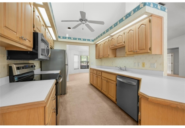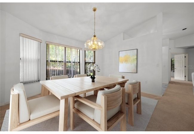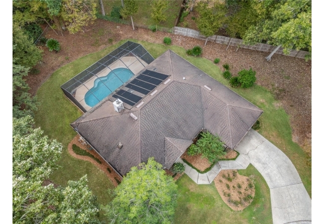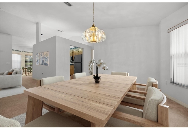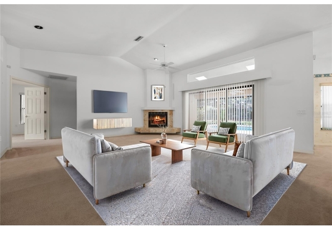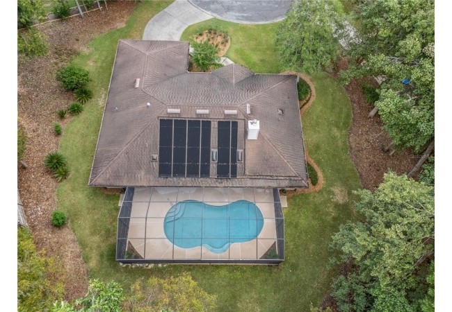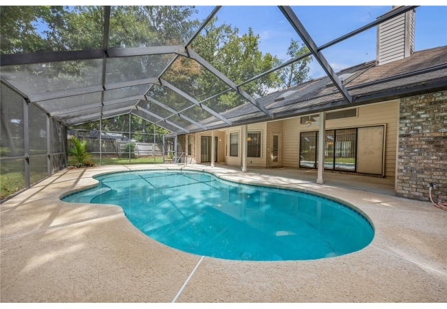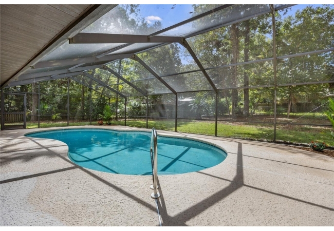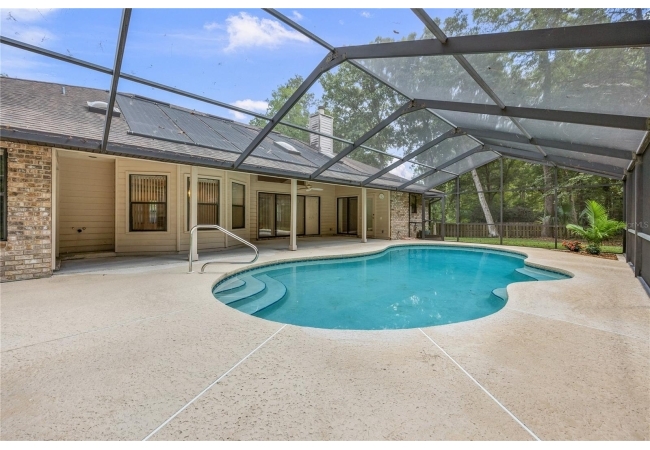 Outdoors, a triple sliding glass door opens from the living room to a covered patio overlooking the screened-in pool. The pool area is well-maintained with an updated pool pump and filtration system, a cleanly surfaced deck, and a solar heating setup for extended swim seasons.