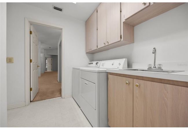 Practical features include an interior laundry room with a utility sink and the washer and dryer already in place. The wide cul-de-sac lot provides extra space between neighbors along with a generous cleared yard area for recreation or gardening.