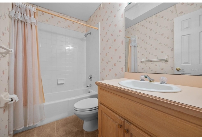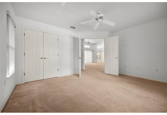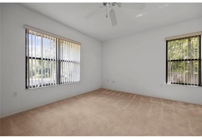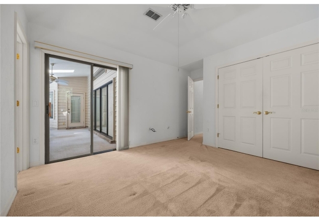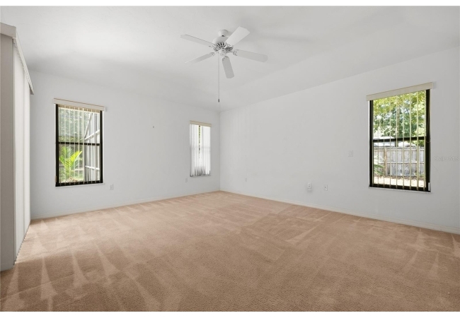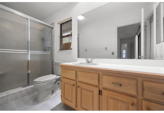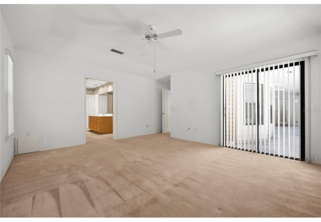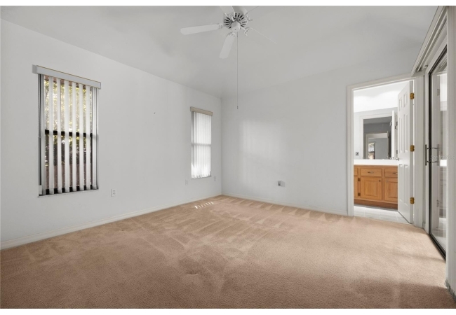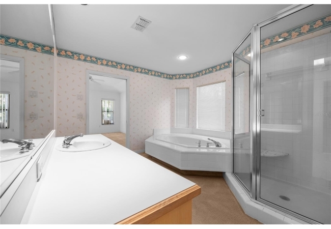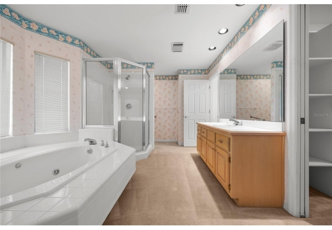 The spacious primary suite is a retreat of its own, featuring a large walk-in closet and an ensuite bath complete with a jetted Jacuzzi tub, a walk-in shower, and abundant natural light. Bedrooms two and three are generously sized, and the third full bathroom includes exterior access to the pool area, making it a convenient dedicated pool bath.