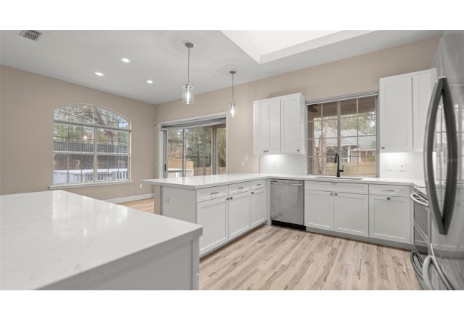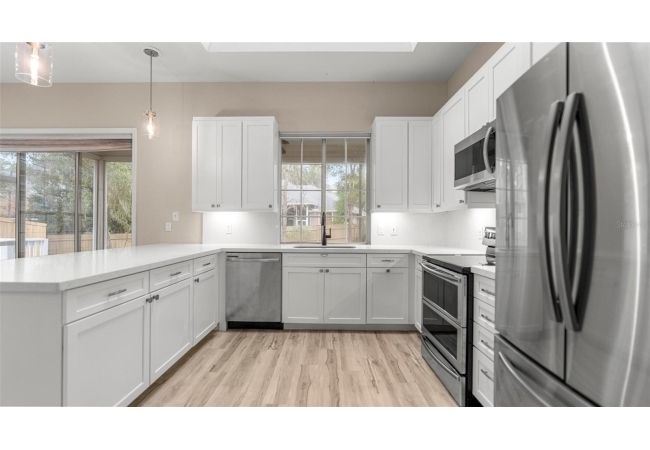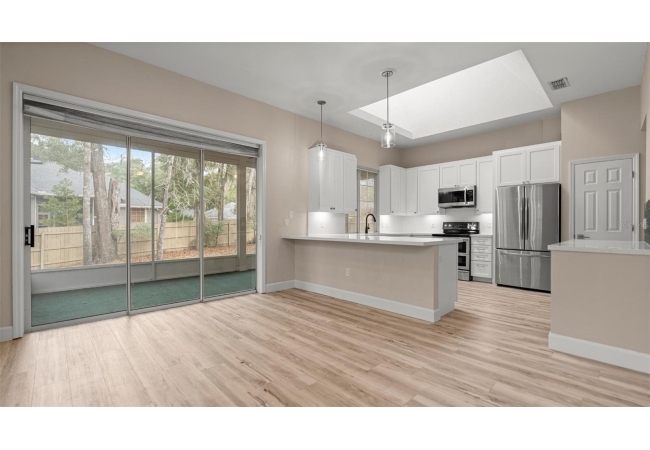 Discover this beautifully updated home in the desirable community of Hampstead Park at Haile Plantation. With over 2,000 sqft of thoughtfully designed living space, this property blends modern upgrades with the charm and walkability Haile is known for. An open, light-filled layout welcomes you in, leading to a renovated kitchen with white cabinetry, quartz countertops, stainless-steel appliances, and both gas and electric cooking options. The spacious living area flows seamlessly to the enclosed lanai and outdoor deck, perfect for relaxing and entertaining.