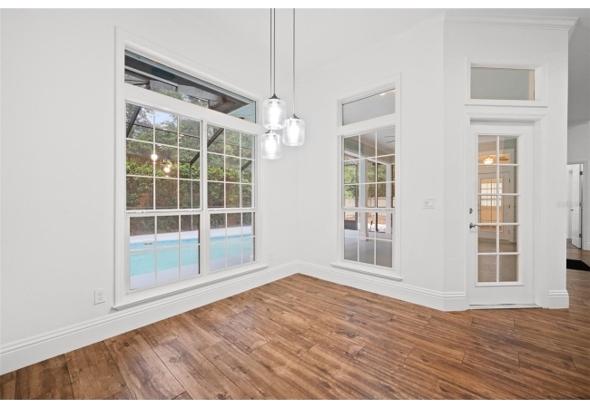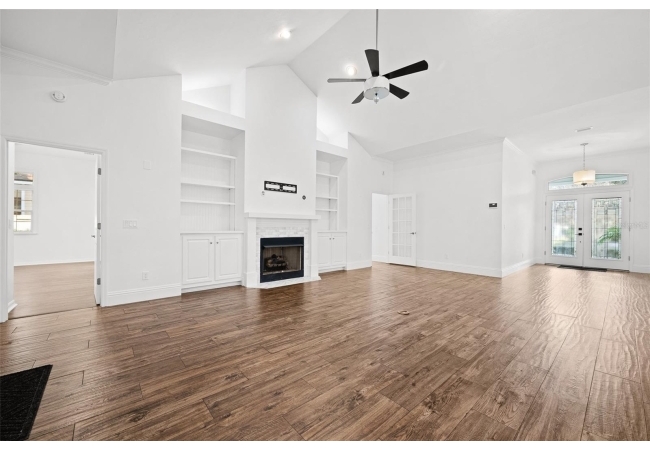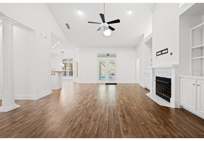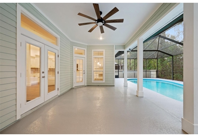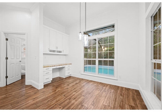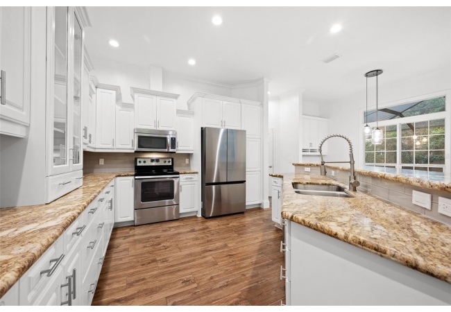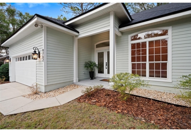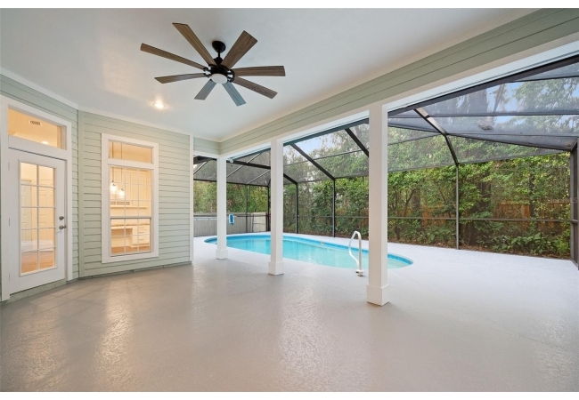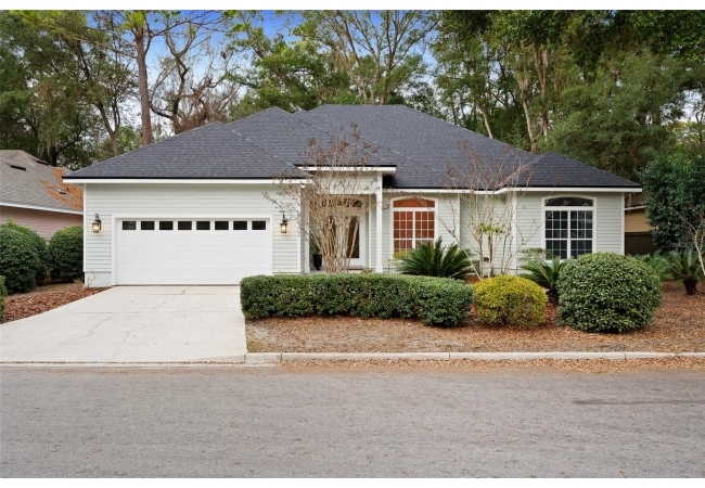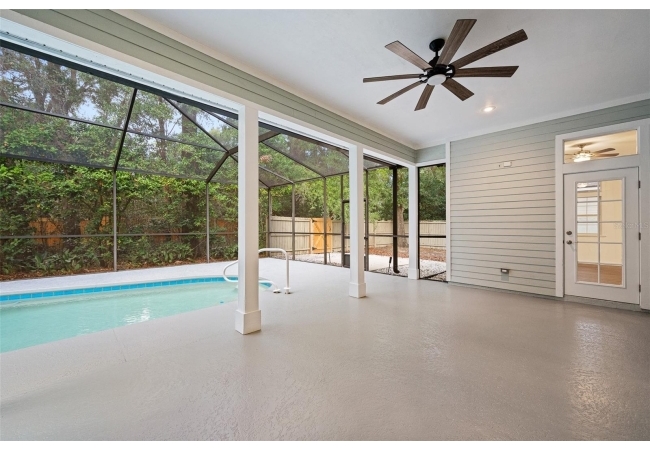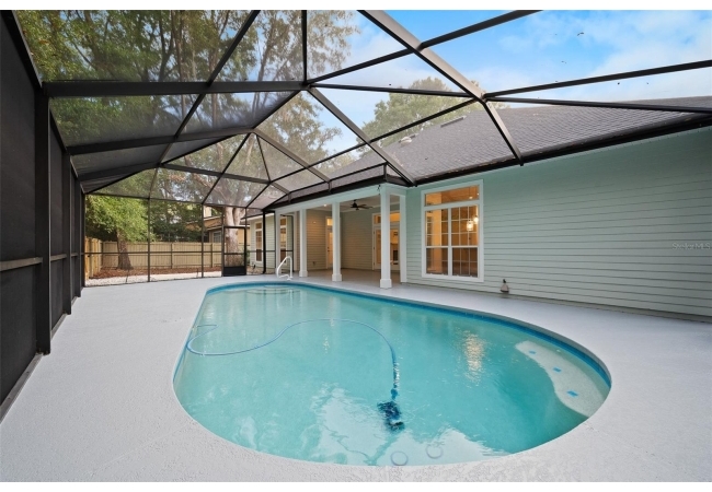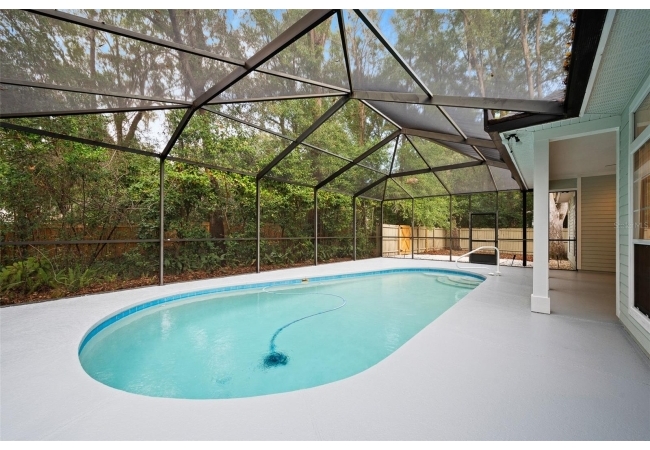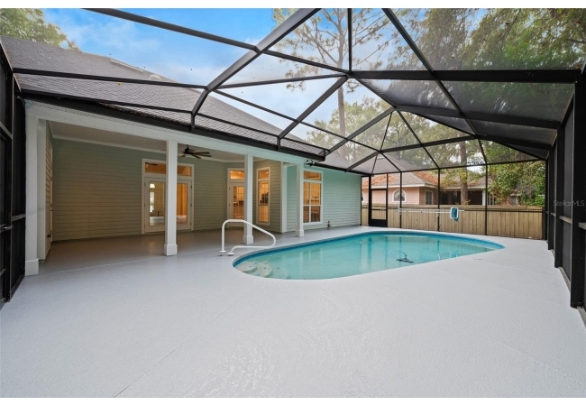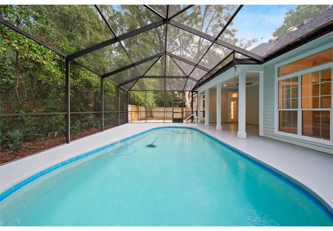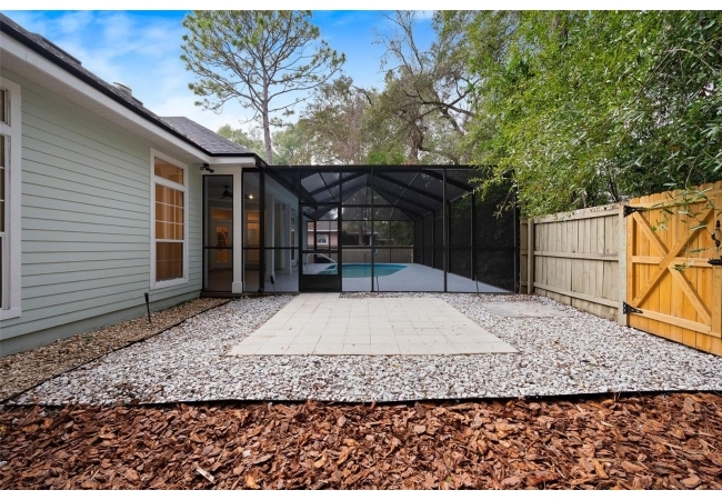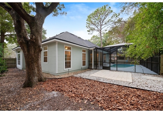 Move right into this beautifully appointed four bedroom, two bath pool home offering great design and every day functionality located just steps away from the newly renovated Hampstead park and playground. From the moment you enter, you are greeted by a welcoming foyer that opens into a stunning great room featuring vaulted ceilings, a cozy fireplace situated between custom built-ins, and an abundance of natural light. A separate dining room offers generous space for gatherings and is accented by an elegant chandelier. Designed for both everyday living and entertaining, the expansive kitchen features granite countertops, stainless steel appliances, and an oversized, custom built, walk-in pantry. The primary suite features a a spacious walk-in closet with custom built-ins and a bright en-suite bathroom complete with dual sinks, a soaking tub, a walk-in shower, and lots of natural light. Step outside to the screened lanai and enjoy the beautiful pool, recently resurfaced in 2025 and enhanced with a new heater, saltwater system, and filtration system in 2025. This private outdoor space overlooks a serene wooded common area that will never be built on, creating a tranquil backdrop for relaxing or entertaining. Roof-2023, HVAC-2025, water heater-2025, pool cage re-screened-2025 and a new refrigerator and dishwasher-2023. A beautiful Speed Queen washer and dryer set convey with the property. The home is a very short distance from Chiles Elementary and the Hawkstone Country Club and Golf Course. Haile Plantation offers an exceptional lifestyle with miles of walking trails, parks, playgrounds, basketball courts, and a Village Center with shops, restaurants, and a Saturday farmers market. The Hawkstone Country Club (membership required) features dining, golf, tennis, pickleball, a fitness center, and two pools.