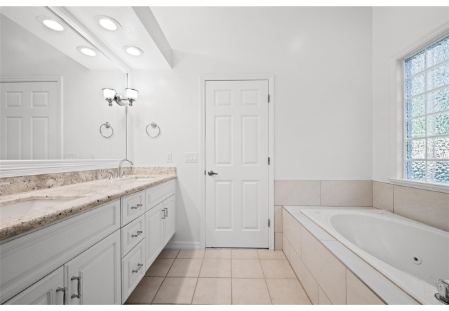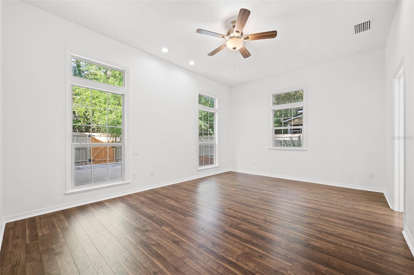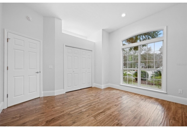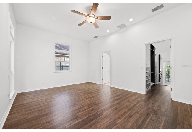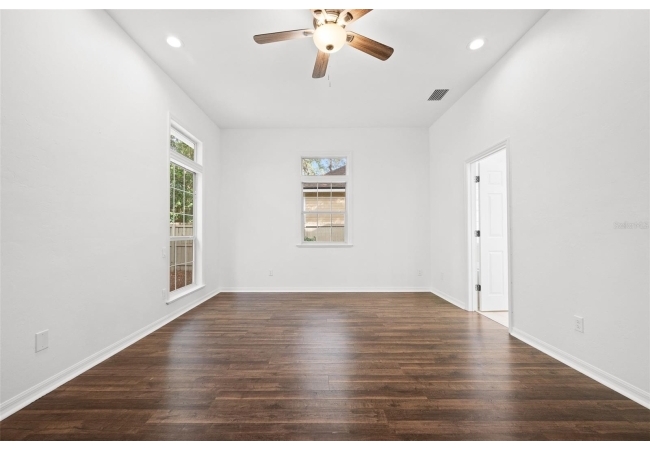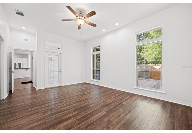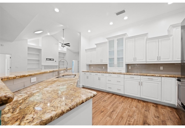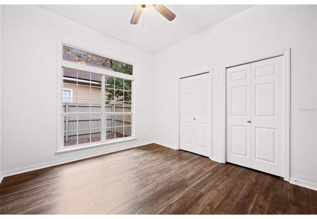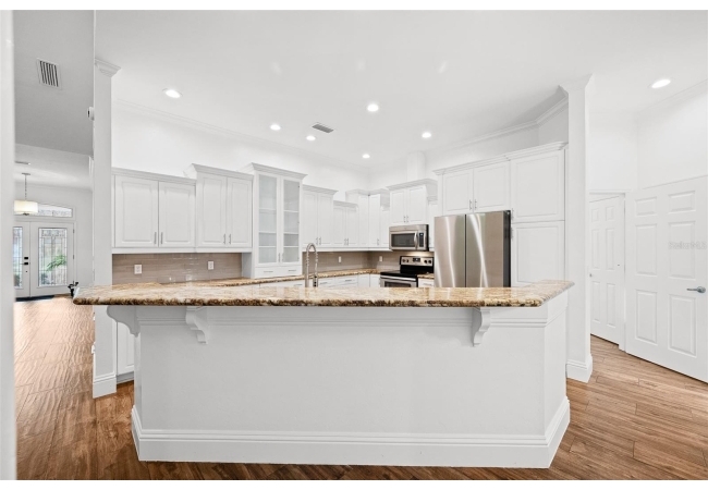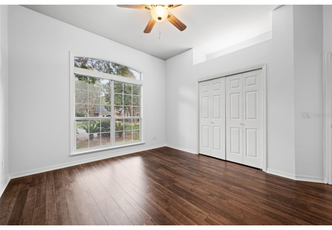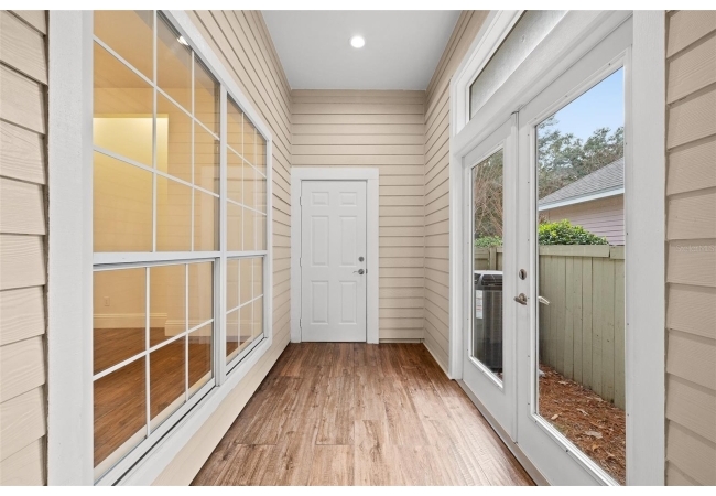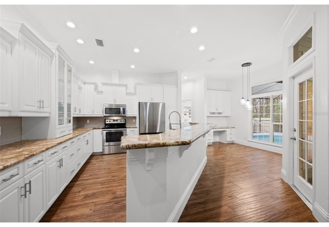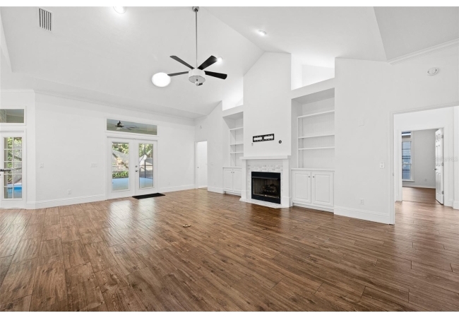 Move right into this beautifully appointed four bedroom, two bath pool home offering great design and every day functionality located just steps away from the newly renovated Hampstead park and playground. From the moment you enter, you are greeted by a welcoming foyer that opens into a stunning great room featuring vaulted ceilings, a cozy fireplace situated between custom built-ins, and an abundance of natural light. A separate dining room offers generous space for gatherings and is accented by an elegant chandelier. Designed for both everyday living and entertaining, the expansive kitchen features granite countertops, stainless steel appliances, and an oversized, custom built, walk-in pantry. The primary suite features a a spacious walk-in closet with custom built-ins and a bright en-suite bathroom complete with dual sinks, a soaking tub, a walk-in shower, and lots of natural light. Step outside to the screened lanai and enjoy the beautiful pool, recently resurfaced in 2025 and enhanced with a new heater, saltwater system, and filtration system in 2025. This private outdoor space overlooks a serene wooded common area that will never be built on, creating a tranquil backdrop for relaxing or entertaining. Roof-2023, HVAC-2025, water heater-2025, pool cage re-screened-2025 and a new refrigerator and dishwasher-2023. A beautiful Speed Queen washer and dryer set convey with the property. The home is a very short distance from Chiles Elementary and the Hawkstone Country Club and Golf Course. Haile Plantation offers an exceptional lifestyle with miles of walking trails, parks, playgrounds, basketball courts, and a Village Center with shops, restaurants, and a Saturday farmers market. The Hawkstone Country Club (membership required) features dining, golf, tennis, pickleball, a fitness center, and two pools.