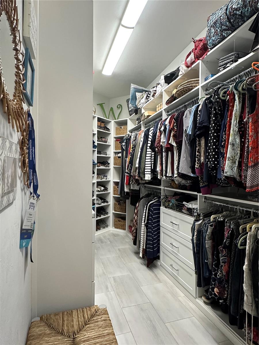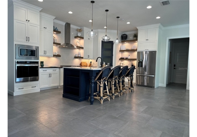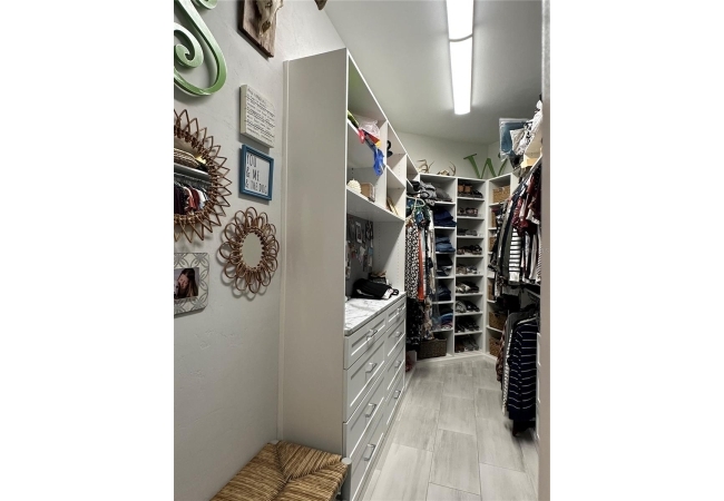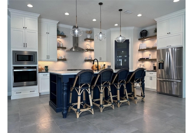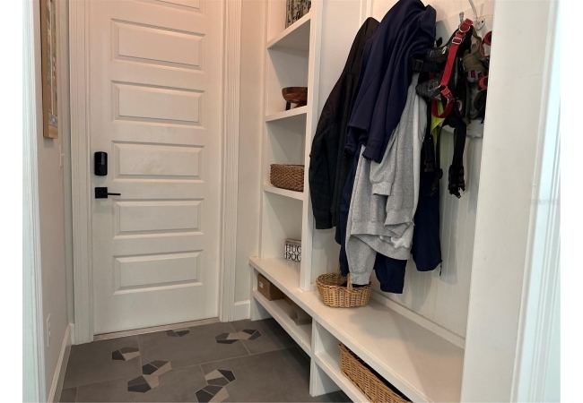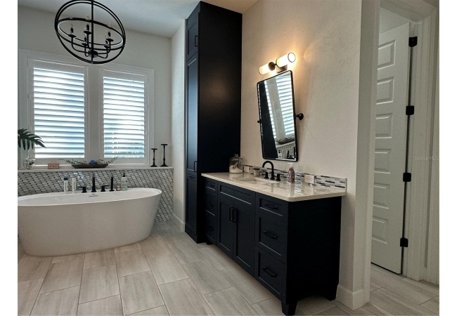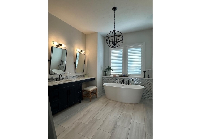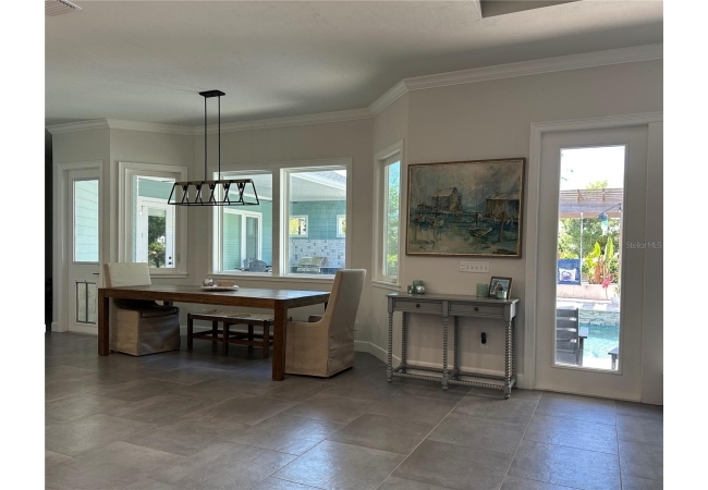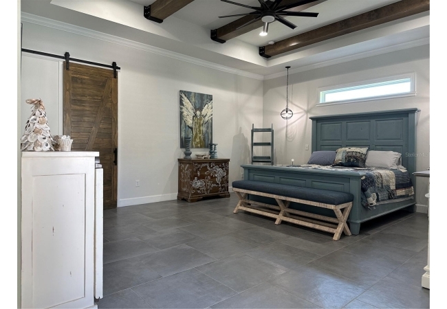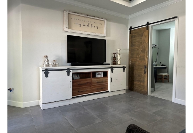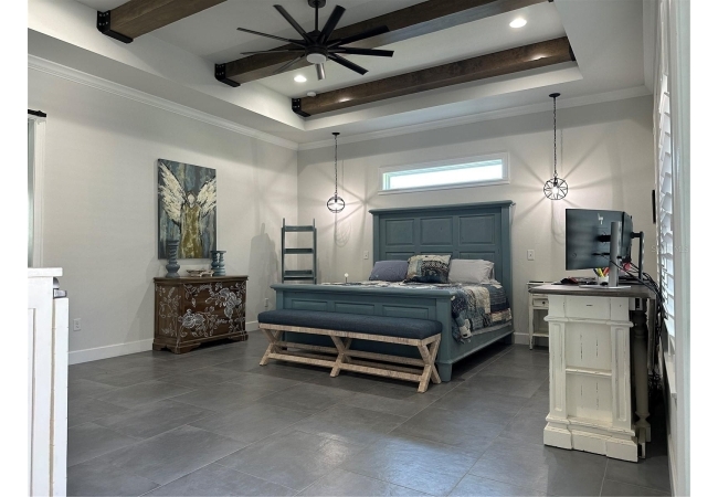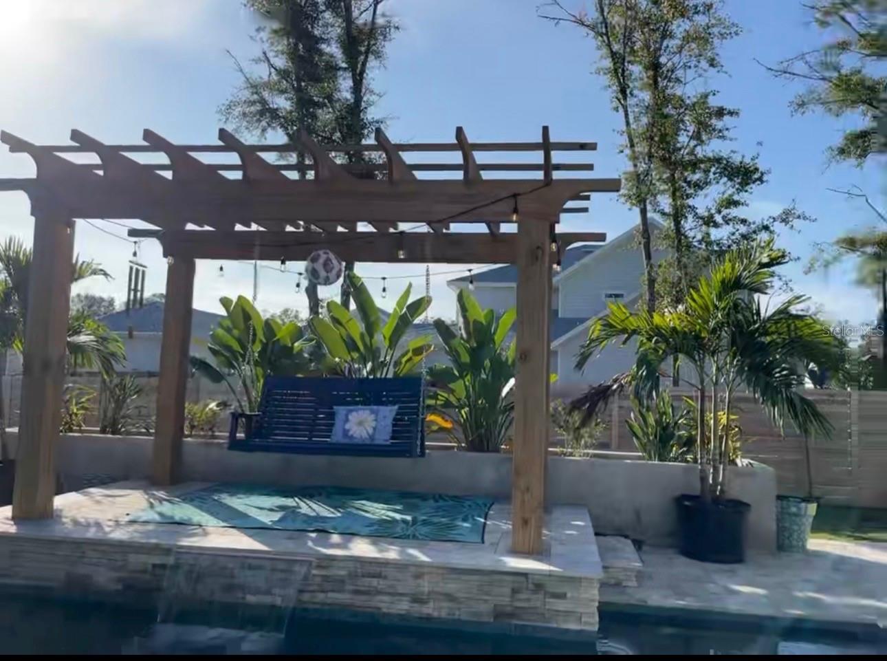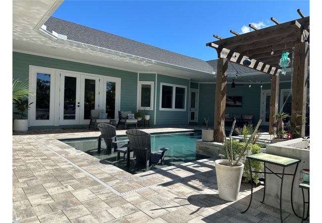 Beautiful Custom Courtyard Pool Home in the Town of Tioga — Your Private Oasis Awaits. This home offers custom craftsmanship, flexible living spaces, and a true indoor-outdoor lifestyle designed to be enjoyed every day. Indoor comfort and outdoor relaxation come together seamlessly. Enter through the private lanai and you’re immediately greeted by a sparkling saltwater pool with tranquil waterfall, expansive sun shelf, and an inviting pergola with swing and an outdoor kitchen — the perfect setting for quiet evenings or year-round entertaining with family and friends. Inside, walls of windows fill the home with natural light, highlighting soaring ceilings, rustic wood beams, and a custom-built entertainment center that creates a warm yet elevated living space with beautiful new (2025) tile throughout. The thoughtfully designed kitchen is both stylish and functional, featuring tall custom cabinetry, stainless steel Whirlpool appliances, gas range, floating shelves, hidden outlets for a clean look, and a dedicated bar/coffee station. A large quartz island with farmhouse sink, bar seating, and built-in bookcase anchors the space, while the oversized walk-in pantry offers exceptional custom storage. The primary suite is a peaceful retreat with direct access to the pool and patio — perfect for starting your mornings or unwinding at the end of the day. Rustic beams continue the custom design, while the spa-like ensuite bath offers dual vanities, makeup station, built-in storage, soaking tub, and a large walk-in shower with rain head and bench seating. Two expansive custom walk-in closets complete the space. A guest bedroom features a built-in desk, reading nook, and custom closets with a beautifully appointed bathroom nearby. The detached third bedroom and bath — with a private entrance from the pool courtyard — provide incredible flexibility as an in-law suite, guest quarters, or private office, complete with custom-built-ins and an en-suite bath. The dream laundry room features tall custom cabinets, a farmhouse sink, a drying rack, and thoughtful pet-friendly amenities. Outside, the fully fenced and professionally landscaped yard enhances privacy and relaxation. The saltwater pool includes a new cleaner and filter. Water irrigation with drip lines services both landscaping and lanai planters. Additional features include oversized 2.5-car garage (golf cart friendly) with private alley access, functional mudroom drop zone with bench and storage, two tankless water heaters, garage prepped for water softener, & new gutters (2025).