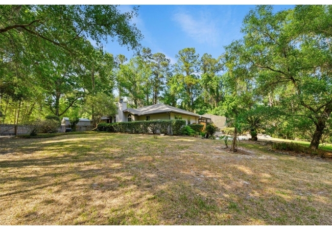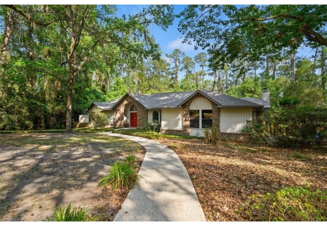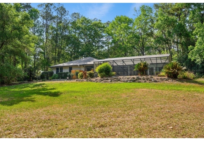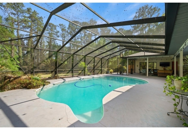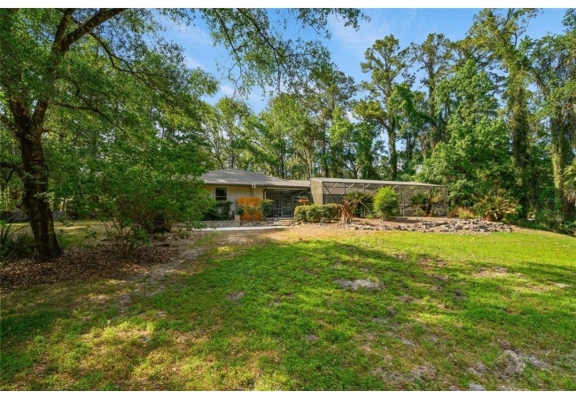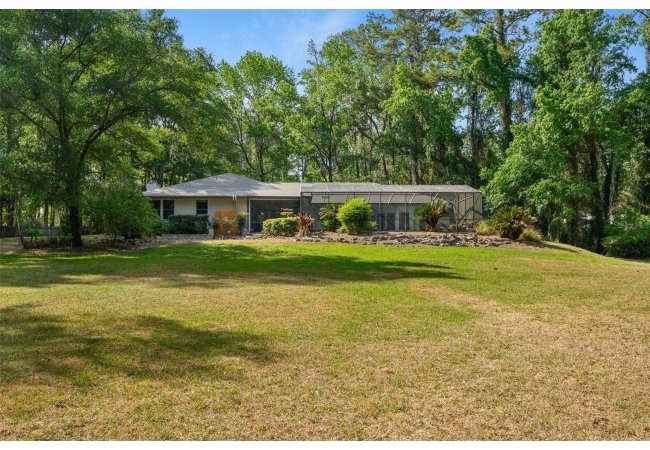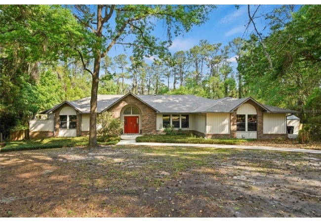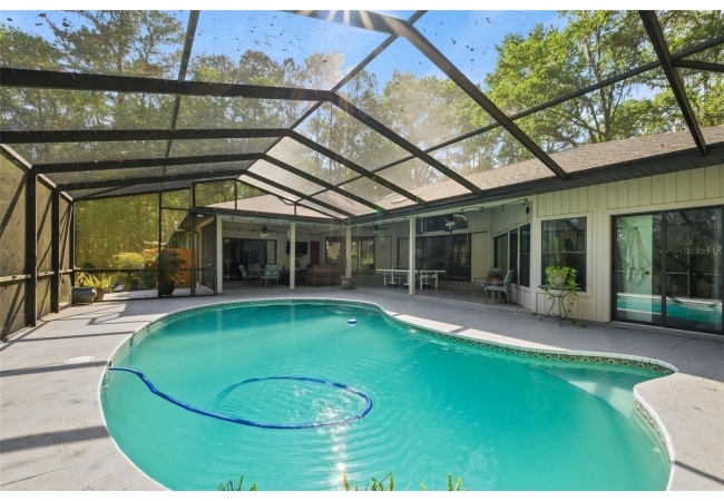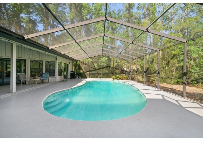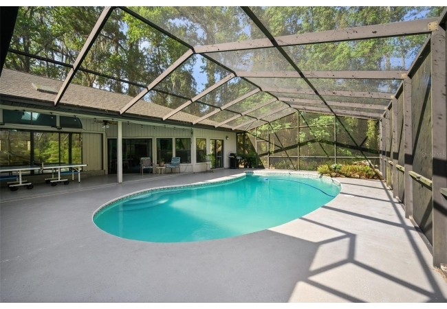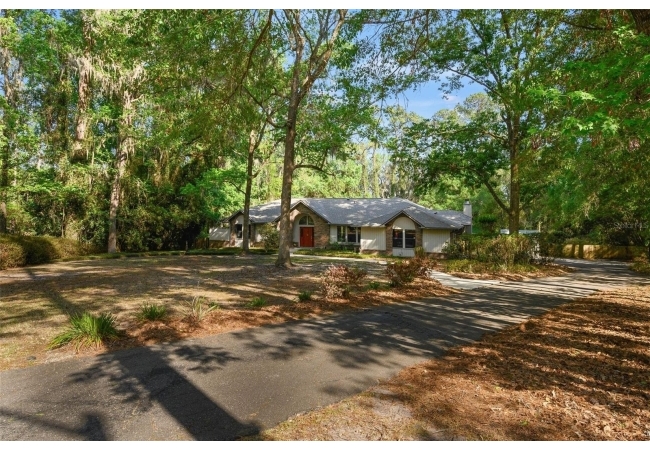 Beautiful and Spacious POOL Home on TWO ACRES in the lovely Fort Clarke Forest neighborhood. This 4-Bedroom/3-Bath Home, with Office, which could be used as a 5th bedroom, is located along the most scenic portion of the SW 91st Street corridor with easy access to Newberry Road and SW 8th Avenue. The Property is very close to Shopping and the Hawkstone Country Club. It has a NEW ROOF, Fully-Updated Kitchen and Owner's Bathroom, and other bathroom updates. The bedrooms are on either sides of the living areas. The Living Room, Open Family Room/Kitchen, Owner's Suite and one other Bedroom (on the opposite side of house), all open up to the Screened-In Pool "Deck" that has covered living areas. The Living Room and Family Room have vaulted ceilings; there is a Wood-Burning Fireplace in the Family Room and a new Skylight in the Kitchen. An inside Laundry Room with sink and cabinets is connected to a hallway with oversized storage closets and the Office. In lieu of a garage, there is a large multi-purpose room that can be used as a workshop or for inside storage and separate tool storage area. There is also an outdoor Shed. The lot is beautifully landscaped and the setting is very private. One of two Water Heaters was very recently replaced. Schedule your tour today!